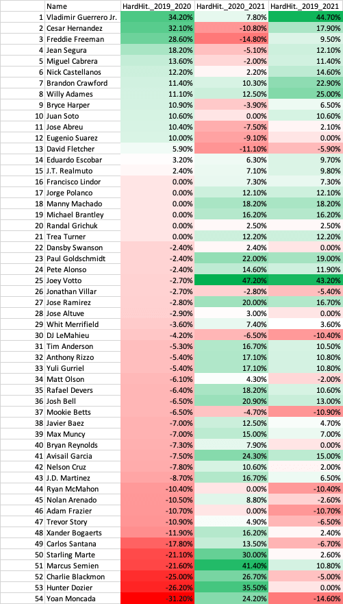 51.9% of players decreased in Hard Hit % in 2020 and increase in 2021.