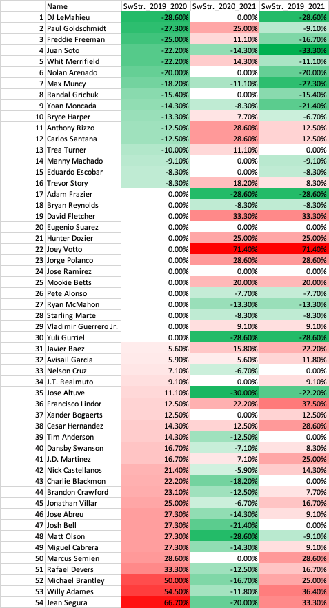 I took data via Fangraphs of qualified hitters in 2019, 2020, and 2021. For wOBA, Swinging Strike %, and Hard Hit % I looked at the percent change between 2019-2020, 2020-2021, and 2019-2021 while for fWAR just the differences for those time periods (since fWAR can be negative). To assess the impact of 2020, we must look at 2019, 2020, and 2021. Sharp improvements or declines in metrics in 2020 could have been due to the nature of the season, thus I explored 2019, 2020, and 2021 (had to be qualified in 2019, 2020, and 2021) which resulted in 54 players. Due to injuries, among other things, this caused the decline in the number of players in the data set. Could I have made the criteria less strict for the data set? Absolutely, but then we have smaller sample sizes (in this case plate appearances) for players. Always pros and cons but for this analysis I took qualified players over those three seasons.