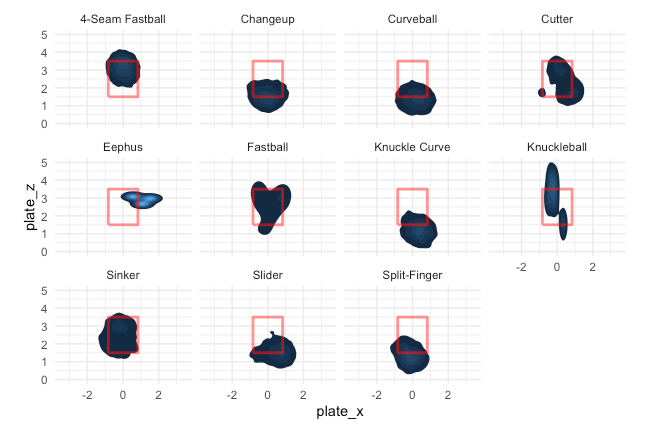 For this plot, the lighter the blue the more pitches in that area. This is from the catcher’s perspective. We can see clear trends that changeups and curveballs down as well as 4-seam fastballs up induce whiffs.