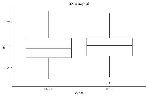 What else could influence a whiff? Let’s look at accelerations in the x direction (left/right, ax), and in the z direction (up/down) az.