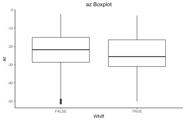 There is a statistical significance in both cases. In statistics language we can say that we reject the null hypothesis that there is no difference in means of ax and az based on if a hitter whiffs in favor of the alternative that there is a difference. Based on the confidence interval, we see that ax is higher when a hitter whiffs (positive is running right from the catchers perspective) and az is lower when a hitter whiffs (negative is dropping down). In simple terms, there is a difference that isn’t due to just chance.