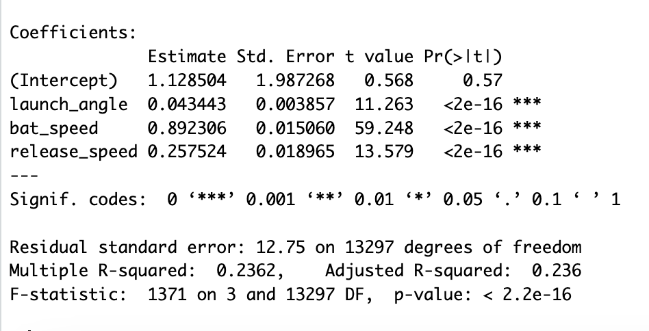 Next, we will model exit velocity (Exit_Velo ~ Pitch_Speed + Launch_Angle + Bat_Speed)