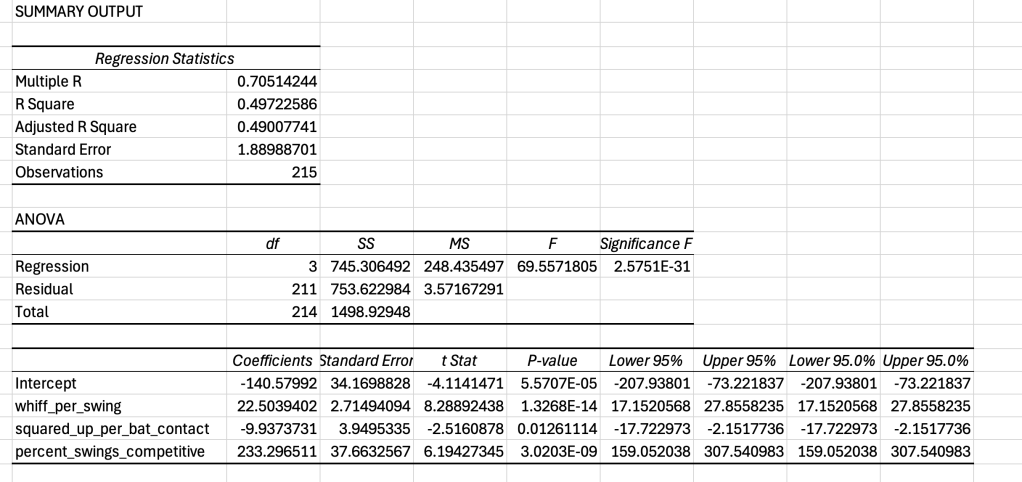 Bat Speed ~ -140.6 + 22.5*Whiff_Per_Swing – 9.94*squared_up_per_bat_contact + 233.3*percent_swings_competitive