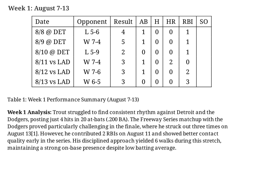 Although expansive analyses, ChatGPT could not hone in directly to that time period. Instead it talked about the whole month of August. Overall it is a good summary but not exactly a scouting report. Let’s look at a different LLM.
