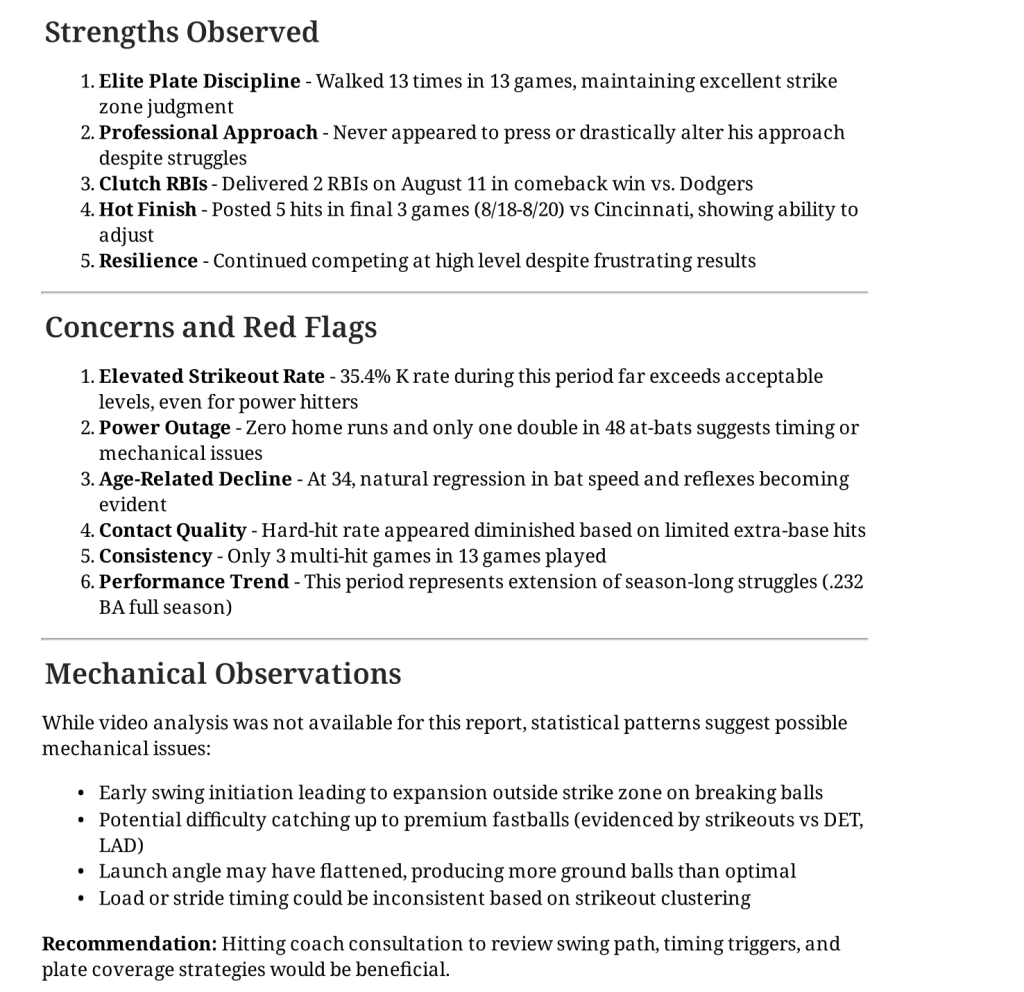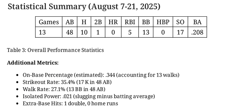 - Consistency & timing: Struggles with timing and pitch recognition were evident in decreased batting average and slugging during Aug. 7–21.