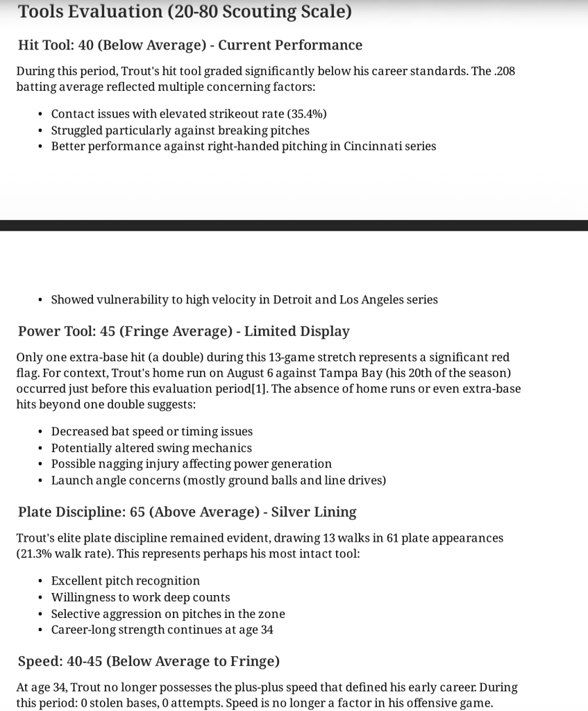 This period was not representative of Trout’s peak performance levels. While he continued to show glimpses of power and maintained a disciplined eye, his batting average and slugging were depressed, timing was off, and production lagged relative to expectations for an elite hitter. Lingering health concerns and adjustment to a DH-heavy role likely contributed to the uneven showings. That said, his veteran approach and ability to draw walks kept value from falling further.