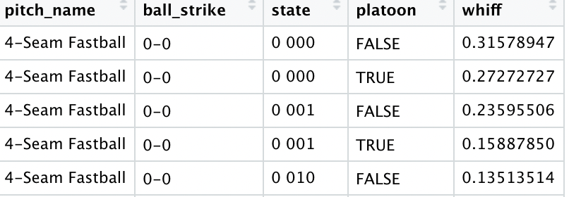Similar story here, with four seam fastballs being thrown the most. The majority of hits on 0-2 are sliders followed by the four-seam fastball.